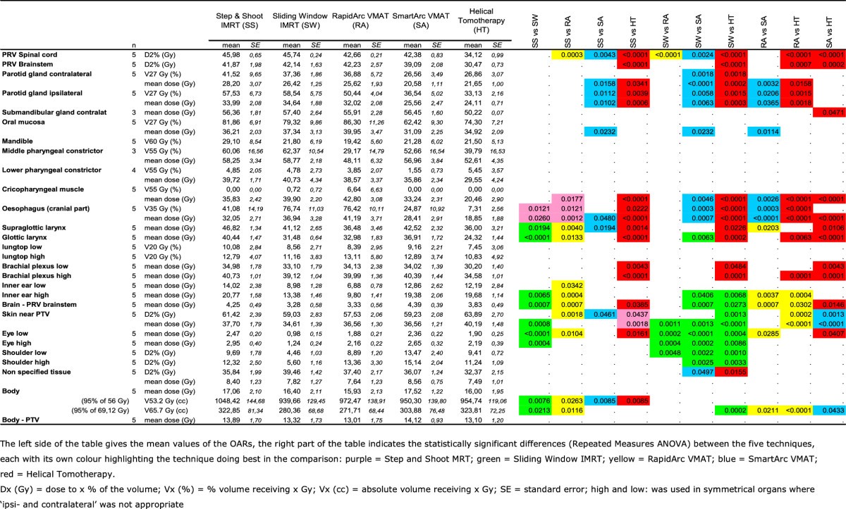 PTV 56Gy : compared to the PTV69Gy, the D50% guideline was generally less well respected, D98% was only respected by HT. A statistically significant lower homogeneity index was created by RA compared to HT, SW, SA and SS. The Conformity index PTV56Gy was statistically worst for SS.
